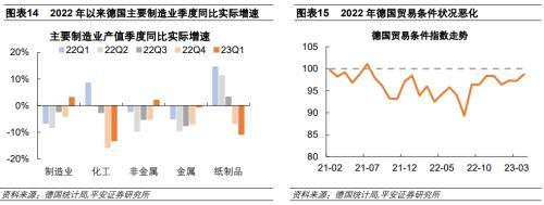 德國能源密集型行業(yè)受到的產(chǎn)出沖擊在2022年第4季度凸顯,化工和紙制品行業(yè)受到的影響尤甚。采用德國批發(fā)價格指數(shù)進行平減,可以看到在2022上半年,德國制造業(yè)產(chǎn)出整體上受高通脹的嚴重沖擊,但能源密集型行業(yè)的產(chǎn)出表現(xiàn)存在差異,化工和紙制品行業(yè)甚至出現(xiàn)了逆勢增長。德國能源價格漲幅最大的是2022年第3季度,此時能源密集型行業(yè)已經(jīng)出現(xiàn)了較為明顯的實際產(chǎn)出下降。考慮到可能存在一定的庫存消耗和價格粘性等帶來的滯后影響,2022年4季度德國能源密集型行業(yè)產(chǎn)出受到的沖擊進一步加大,尤其是化工行產(chǎn)出同比實際增速下降15.7%,出現(xiàn)了較大調(diào)整;金屬制品、紙制品和非金屬制品也分別下降了6.8%、6.6%和5.1%,均高于制造業(yè)整體降幅4.1%。2023年第1季度,隨著能源價格快速回落,德國整體制造業(yè)產(chǎn)出同比實際增長3.1%,但化工和紙制品行業(yè)分別同比實際下降13.2%和10.8%,拖累依然嚴重。從德國貿(mào)易條件指數(shù)來看,2021年以來德國貿(mào)易條件指數(shù)震蕩走低,尤其是在2022年能源價格走高后,貿(mào)易條件指數(shù)加速下滑,于2022年8月降至低點89.3%,即使之后恢復(fù)增長,截至2023年4月仍然小于100。貿(mào)易條件指數(shù)的惡化充分反映了本輪能源危機對德國貿(mào)易的負面沖擊。