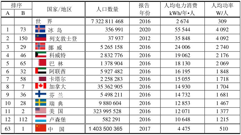 表中:A—表示人均能源和電力消費(fèi)最多的排序;B—表示該國電力產(chǎn)量的世界排序。