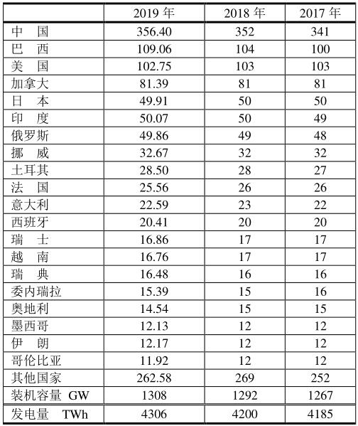 根據(jù)BP 2020的報告,中國水力發(fā)電量居世界之首,2019年占全球水力發(fā)電量的1269.7/4222.2=30.1%;其次為巴西、加拿大。