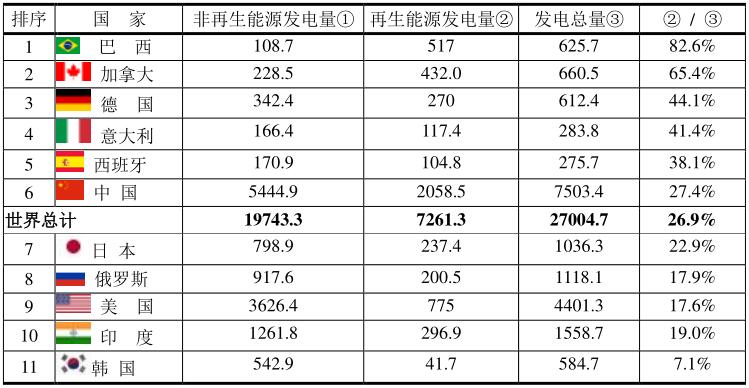根據(jù)BP 2020年的報告,2019年全球再生能源發(fā)電量7261.3 TWh占全球總發(fā)電量27004.7TWh的平均數(shù)為26.9%。超過平均數(shù)的國家有個特點:水力發(fā)電特別多的國家如巴西、加拿大;利用風力發(fā)電和光伏特別多的國家如意大利、西班牙、德國等,而富產(chǎn)化石燃料的國家如美國、俄羅斯就比較低。