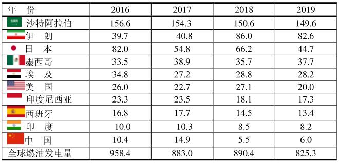 2016~2019年前十位國家燃油發(fā)電(單位:TWh)