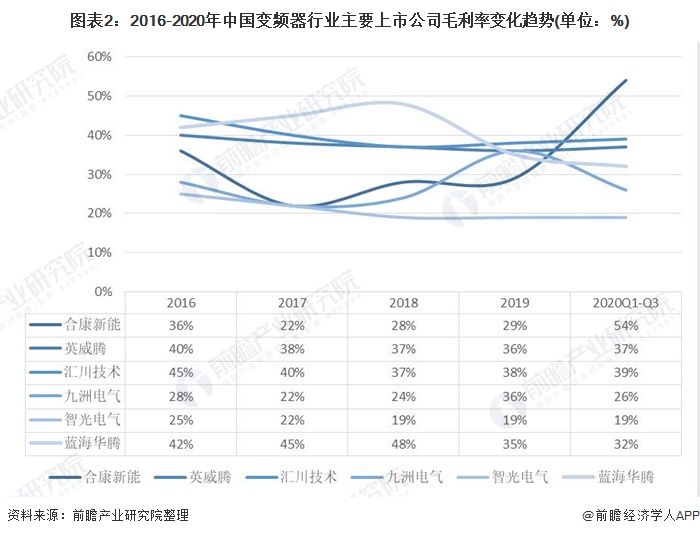 從我國(guó)上市公司近幾年的毛利率變化來(lái)看,變頻器行業(yè)主要上市公司的毛利率略有下降,但是整個(gè)行業(yè)的獲利水平較高,經(jīng)營(yíng)效益良好。2018年,6家上市公司的毛利率維持在20%-50%之間;2019年,各公司的毛利率差異進(jìn)一步縮小,集中在30%-40%之間。2020年前三個(gè)季度,各公司的毛利率依然多集中在30%-40%之間。