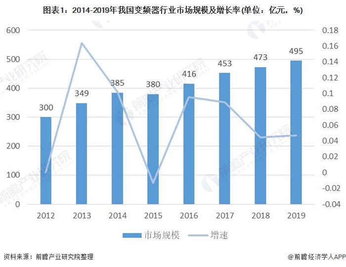 我國(guó)變頻器行業(yè)的市場(chǎng)規(guī)模整體呈上升態(tài)勢(shì),從2012年至2019年,中國(guó)變頻器行業(yè)規(guī)模除2015年有小幅度下降以外,其余年份均處于穩(wěn)步增長(zhǎng)狀態(tài)。2019年我國(guó)變頻器行業(yè)的市場(chǎng)規(guī)模達(dá)到495億元,相比2018年增長(zhǎng)4.7%。