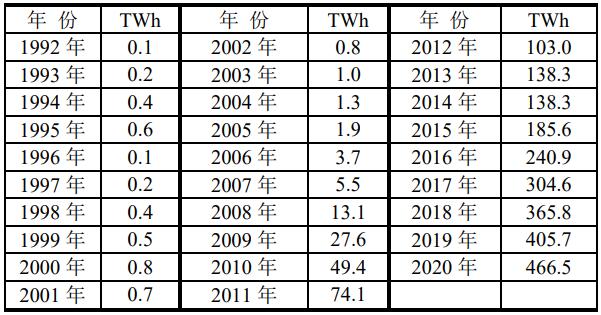 世界上利用風力發(fā)電較晚,風力發(fā)電最早在丹麥,1985年才起步;美國1989年和德國1990年也開跑,中國和印度1992年、隨后西班牙、澳大利亞跟進。可以這么說,全球風力發(fā)電基本在一個起跑線上,中國于1992年開始有風能發(fā)電,區(qū)區(qū)之數(shù),不足掛齒,僅為0.1 TWh,當然居世界末尾。2015年中國把久居領先的美國趕下臺了,中國發(fā)力了,把風能發(fā)電拉到世界第一。2020年中國風能發(fā)電量達到466.5 TWh,年增長14.8%,占世界總量的29.3%。