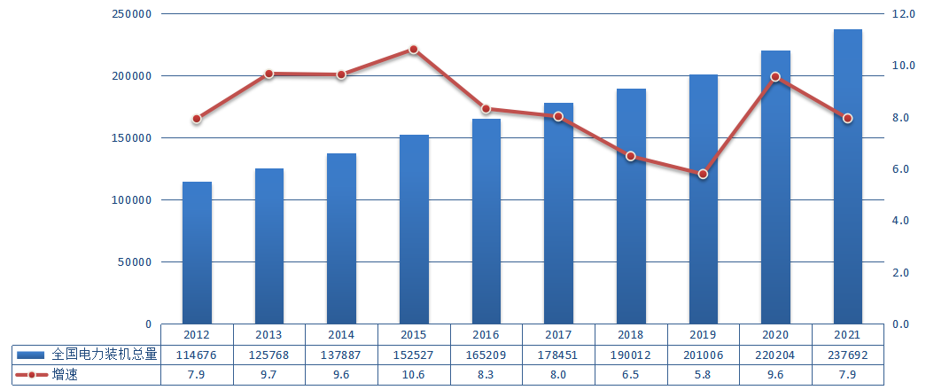 圖4 2012~2021年全國(guó)電力裝機(jī)及增速情況(單位:萬(wàn)千瓦,%)
