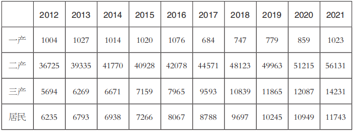 表1 2012~2021年分產(chǎn)業(yè)用電量(單位:億千瓦時(shí))