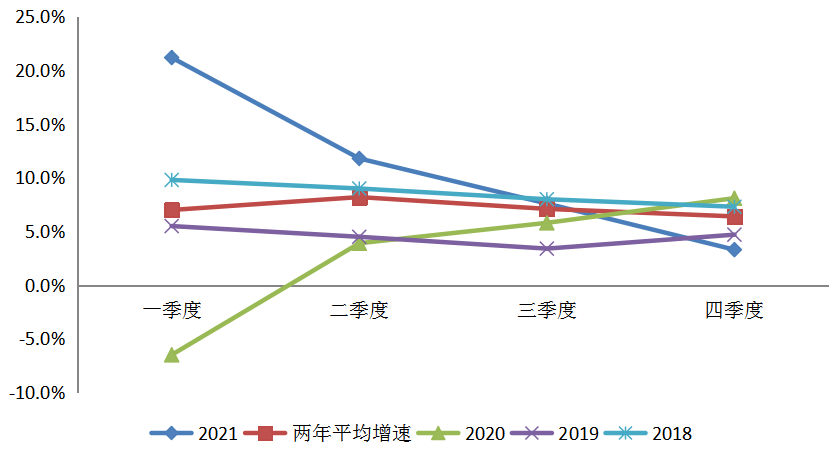 圖2 2018~2021年全國(guó)全社會(huì)用電量季度增速(單位:%)