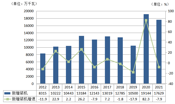 圖7 2012~2021年全國(guó)新增電力裝機(jī)及增速情況