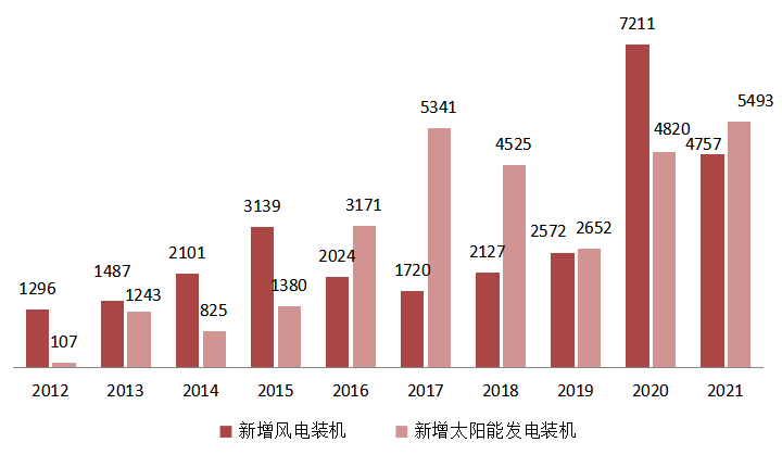圖10 2012~2021年新增風(fēng)電、太陽(yáng)能發(fā)電裝機(jī)情況(單位:萬(wàn)千瓦)