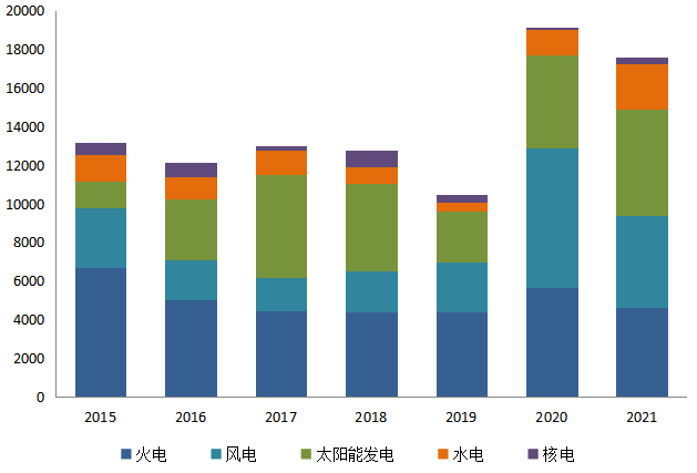 圖8 2015~2021年全國(guó)新增電力裝機(jī)結(jié)構(gòu)對(duì)比(單位:萬(wàn)千瓦)