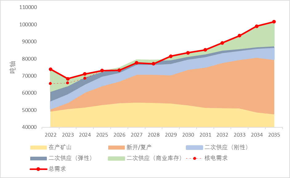 · 2032-2035年,價格由60美元/磅迅速上漲。2032年以后,核電天然鈾需求繼續(xù)增長,目前已知的在產、復產、在建、計劃礦山產量及二次供應彈性部分持續(xù)下降,因此剛性缺口逐漸擴大,若無新勘查開發(fā)的鈾礦山投入生產補充一次供應,商業(yè)庫存將被大量消耗,現(xiàn)貨價格將進入快速上漲階段。