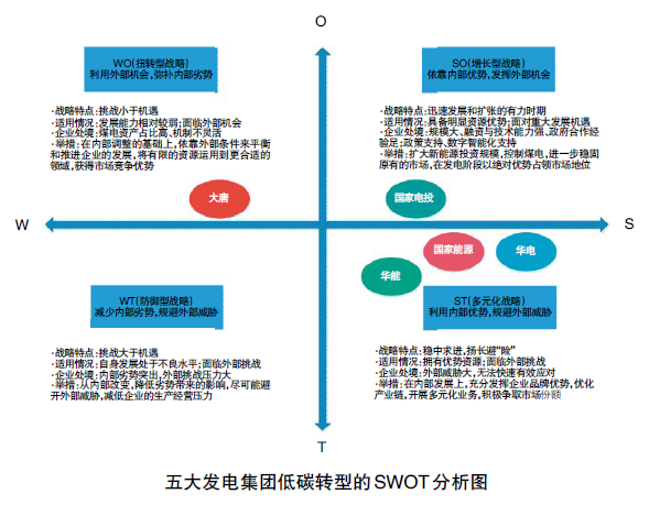 基于上述分析,結(jié)合五大發(fā)電集團(tuán)的發(fā)展特點(diǎn)總結(jié)出如圖所示的SWOT分析矩陣與轉(zhuǎn)型對策。