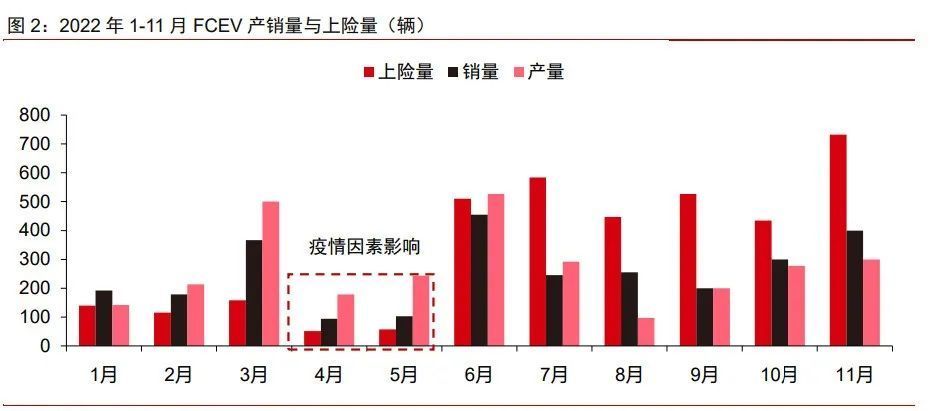 根據(jù)中汽協(xié)以及中信保數(shù)據(jù),2022年前11月FCEV產(chǎn)量為2969輛,銷量為 2789輛,上險總數(shù)為3755輛。2022年上半年產(chǎn)量一直大于銷量,主要系 2021年下半年確定燃料電池示范城市群政策,業(yè)內(nèi)熱情與預(yù)期較高。但是受制于疫情與補貼落地速度,銷量推進速度較慢,形成了一定的庫存壓力。據(jù)氫云鏈微信公眾號數(shù)據(jù),2021年年底庫存量為280輛左右,今年7月庫存增加到750 輛,導(dǎo)致8月開始減產(chǎn)去庫存。從上險量數(shù)據(jù)看,2022年前5月上險量數(shù)據(jù)欠佳,6月上險量陡增,一方面是因為6月疫情相對緩和,前期被延遲的訂單出現(xiàn)了集中交付的情況;另一方面也與示范城市群首年推廣考核臨近(2022年8 月)有關(guān),但是除京津冀城市群以外,其他城市群第一年推廣進度并不理想,2022年跟計劃相比“拖欠”的量,或在2023年釋放。
