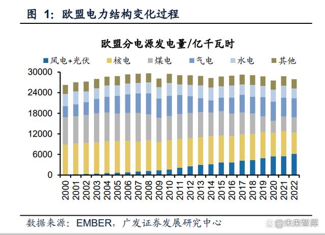 (1)發(fā)電量持穩(wěn),電源相互替代:歐盟整體發(fā)電量在2008年達(dá)到頂峰后回落,2022 年最新發(fā)電量相比20年前并無太大增量,電力結(jié)構(gòu)的演變更多體現(xiàn)在內(nèi)部各種電源 的相互替代;