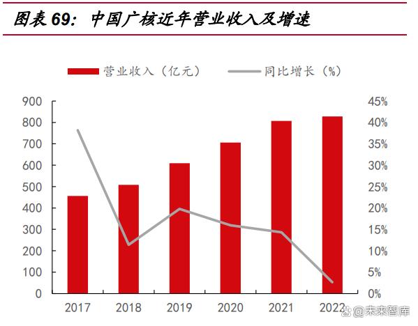 中國廣核是中國廣核集團(tuán)的核電運(yùn)營上市主體,主營業(yè)務(wù)為建設(shè)、運(yùn)營及管理核 電站,銷售核電站所發(fā)電力,組織開發(fā)核電站的設(shè)計(jì)及科研工作。截至 2022 年,公 司管理 26 臺(tái)在運(yùn)和 7 臺(tái)在建核電機(jī)組,裝機(jī)容量分別為 29.38GW 和 8.36GW,在 運(yùn)核電機(jī)組容量占全國在運(yùn)總裝機(jī)容量的 51.91%,是我國最大的純核電運(yùn)營商。 2022 年公司發(fā)電量同比下降,主要原因?yàn)闄z修時(shí)間較 2021 年同期增長,臺(tái)山1、2 號(hào)機(jī)組換料大修拖累公司 2022 年的電量表現(xiàn),公司整體 2022 年發(fā)電量下滑 1.38%(包括聯(lián)營企業(yè)),但公司全年?duì)I收及凈利潤等業(yè)績表現(xiàn)依然實(shí)現(xiàn)了小幅增長。 公司 2022 年?duì)I業(yè)收入 828.2 億元,同比增長 2.7%,歸母凈利潤 99.6 億元,同比增 長 2.1%。