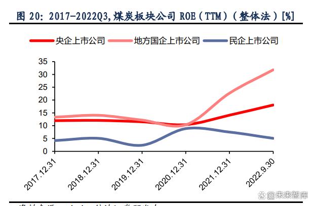 ROE 數(shù)據(jù)方面,煤炭地方國企上市公司表現(xiàn)優(yōu)于央企上市公司。受益于煤炭價格的提升, 資產(chǎn)收益率在 2020 年后迎來了大幅度增長。民企上市公司整體表現(xiàn)弱勢,ROE 呈下降趨 勢,遠低于國企央企表現(xiàn)。PB 估值方面,2020 年后隨著企業(yè)經(jīng)營效益改善和煤炭板塊整體 股價的提升,國企央企上市公司的該項指標也有一定程度的增長,走勢與 ROE 接近。但考 慮到 ROE 的增長幅度更為明顯,我們認為 PB 的增長仍不足以完全反應(yīng)企業(yè)效益增長的速 度。而煤炭行業(yè)在能源政策導(dǎo)向調(diào)整與電力市場化加速推進背景下,疊加新一輪煤礦產(chǎn)能周 期,供需或?qū)㈤L期趨緊,煤炭公司的高收益有望維持,內(nèi)在價值有望逐漸被市場認可,估值 有望迎來進一步修復(fù)。
