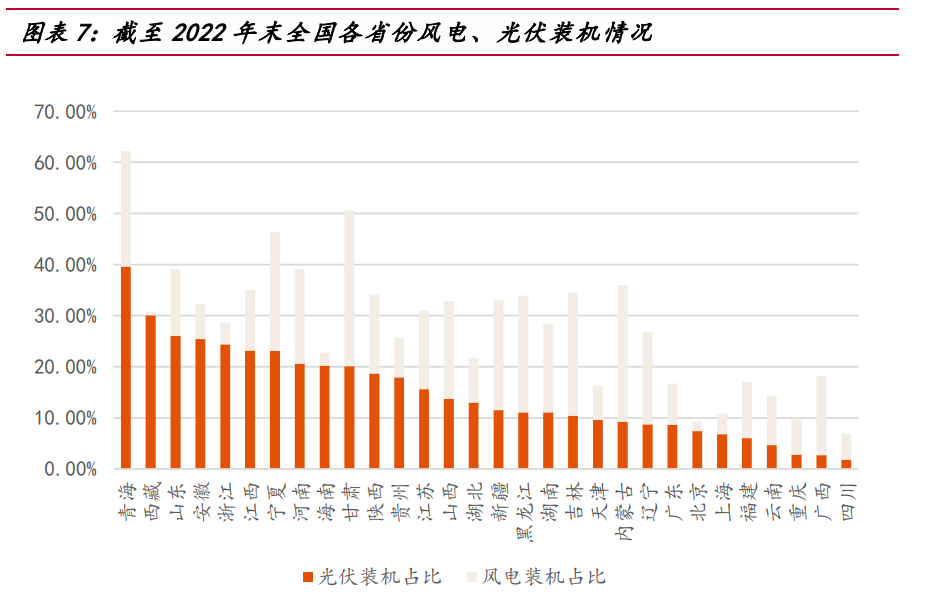 截至 2022 年末,全國各省風(fēng)電、光伏裝機(jī)量占各省總裝機(jī)量比例前五名的為青 海、西藏、河北、寧夏、安徽(按光伏裝機(jī)排序);全國各省風(fēng)電、光伏發(fā)電量占各 省總發(fā)電量比例前五名的為青海、西藏、寧夏、甘肅、山東。 考慮到新能源滲透率與分時(shí)電價(jià)特征高度相關(guān),因此全國多個(gè)省份均可出現(xiàn)類似 山東省的電價(jià)分時(shí)特征,如青海、寧夏、甘肅等。