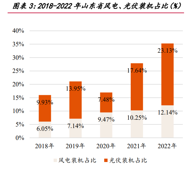 在新能源占比較高的地區(qū),相應(yīng)時(shí)段電價(jià)較低。由于新能源發(fā)電邊際成本低的特 質(zhì),在新能源高發(fā)期間,如果用電需求較低,則相應(yīng)時(shí)段市場電價(jià)較低。以山東省電 力現(xiàn)貨市場為例: 2018-2022 年,山東省風(fēng)電、光伏裝機(jī)容量及發(fā)電量持續(xù)增長,風(fēng)電、光伏裝機(jī) 容量自 1146/1361 萬千瓦增長至 2302/4270 萬千瓦,CAGR 達(dá) 14.97%/25.69%,風(fēng)電、 光伏裝機(jī)占總裝機(jī)量比例自 6.05%/9.93%擴(kuò)張至 12.14%/23.13%;風(fēng)電、光伏發(fā)電量 占總發(fā)電量比例自 2.32%/0.55%擴(kuò)張至 5.28%/11.25%。