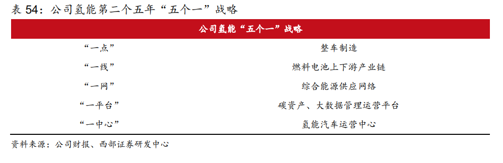 率先布局氫能全產(chǎn)業(yè)鏈,全面啟動“五個(gè)一”戰(zhàn)略。公司于 2017 年在氫能產(chǎn)業(yè)鏈領(lǐng)先廣 泛布局,至 2021 年完成氫能發(fā)展的第一個(gè)五年規(guī)劃,目前已經(jīng)搭建了上游氫氣的“制-儲運(yùn)-加”氫能供應(yīng)體系、中游“膜電極-燃料電池電堆及系統(tǒng)-整車制造”核心裝備產(chǎn)業(yè)鏈,以及 下游六大區(qū)域氫能示范應(yīng)用的三 維格局,形成從研發(fā)—生產(chǎn)制造—商業(yè)化應(yīng)用的“氫能源 全生命周期”創(chuàng)新生態(tài)鏈。2022 年,公司啟動氫能產(chǎn)業(yè)第二個(gè)五年計(jì)劃,確立“五個(gè)一”戰(zhàn) 略。