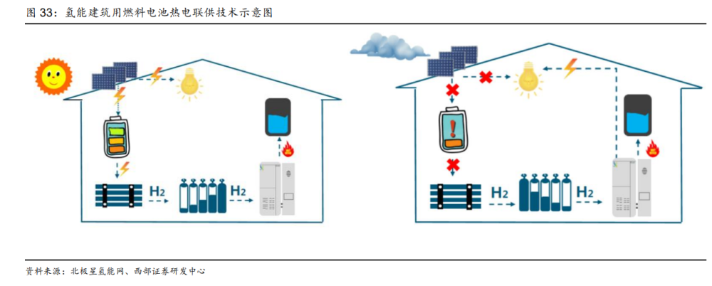 氫建筑應用仍處于導入階段,未來存在較大市場空間。氫能建筑,是近年發(fā)展起來的一種綠色建筑新理念。它以氫能完全或部分替代市政電網(wǎng)、天然氣等傳統(tǒng)能源,滿足建筑對冷、 熱、電、生活熱水等各種能源的需求,在提高建筑用電可靠性的同時,還有助于優(yōu)化國內 的能源結構、降低電網(wǎng)整體投資和減少問題氣體排放。 目前全球建筑供熱和電力需求約占全球能源需求的 1/3。全球多個國家積極探索氫能在建 筑領域應用,利用氫氣通過發(fā)電、直接燃燒、熱電聯(lián)產(CHP)等形式為居民住宅或商業(yè) 區(qū)提供電熱水冷多聯(lián)供。如氫可與天然氣混合(氫氣摻混比例為 0~20%),通過基于燃氣 輪機或燃料電池的 CHP 技術,利用現(xiàn)有建筑和能源網(wǎng)絡基礎設施提供靈活性和連續(xù)性的 熱能、電力供應,從而取代化石燃料 CHP。此外,100% 的純氫可通過氫鍋爐用于建筑 供熱,但氫氣價格需低至 1.5~3.0 美元/kg 時,才能與天然氣鍋爐和電動熱泵競爭。而對 于分布式供暖,氫能是少數(shù)幾種可以與天然氣競爭的低碳替代品,隨著制氫成本和氫鍋爐、 燃料電池成本的下降,以及氫氣利用現(xiàn)有天然氣管道輸送能力的提升,預計到 2030 年, CHP 中氫鍋爐與氫燃料電池的成本為 900~2000 美元/(戶·年),建筑熱電聯(lián)供的氫能 需求量為 3 萬~ 9 萬 t/年。