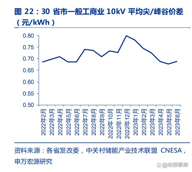 平均峰谷價差逐漸拉大,為工商業(yè)儲能套利提供可能性。2021 年 7 月 26 日,國家發(fā) 改委發(fā)布《關(guān)于進一步完善分時電價機制的通知》,各省響應出臺拉大峰谷價差。根據(jù) CNESA 數(shù)據(jù),2022 年全國 30 省市平均峰谷價差已達到 0.70 元/kWh。自 2023 年以來, 峰 谷 價 差 進 一 步 拉 大 , 全 國 30 省 份 1-6 月 平 均 峰 谷 價 差 達 0.78/0.75/0.72/0.69/0.68/0.69 元每度,除 4 月和 5 月以外,其他月份峰谷價差較 2022 年均有所上漲。