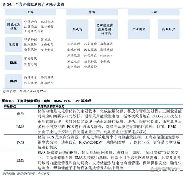 工商業(yè)儲(chǔ)能系統(tǒng)產(chǎn)業(yè)鏈完善,與大儲(chǔ)、戶儲(chǔ)同源。上游是各類設(shè)備,中游是系統(tǒng)集成商和開發(fā)運(yùn)營(yíng)商,下游是工商業(yè)運(yùn)營(yíng)商。上游部件環(huán)節(jié)中,儲(chǔ)能電池模組由電芯經(jīng)過(guò)串并聯(lián)組成用以儲(chǔ)存電力;逆變器進(jìn)行交流電與直流電的轉(zhuǎn)換,根據(jù)功率指令對(duì)電池進(jìn)行充放電;BMS 是控制、管理電池各項(xiàng)功能并保護(hù)電池的核心部件,亦具備和 EMS、SCADA(能量管理系統(tǒng)及監(jiān)控系統(tǒng))通訊功能,目前也有部分電池廠家開始自主設(shè)計(jì) BMS;EMS 控制逆變器并采集逆變器數(shù)據(jù)、控制電池模組并采集電芯數(shù)據(jù)、執(zhí)行邏輯(各種應(yīng)用)并與其他設(shè)備集成調(diào)度。中游集成商與品牌渠道商直接與下游工商業(yè)用戶對(duì)接,需要對(duì)BMS/EMS 系統(tǒng)及儲(chǔ)能應(yīng)用場(chǎng)景有著高理解,且 BMS/EMS 系統(tǒng)基本為自研,以完成對(duì)上游設(shè)備的高效整合。