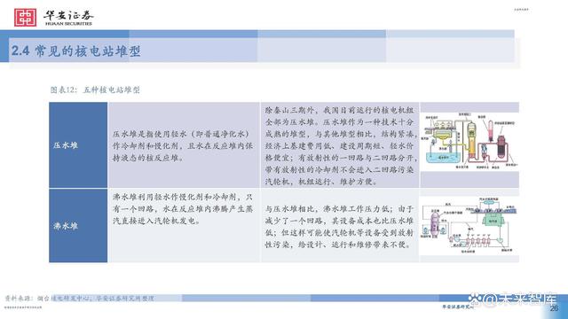目前世界主流核電站皆采用第二代或第三代核電技術。其中,第二代和第三代的 主要核電堆型包括壓力堆和沸水堆等,在安全性和經濟性上較前一代都有提升。第四代核電技術以在安全 性、經濟性、核廢物處理、防止核擴散上更為出色,代表堆型包括鈉冷快堆、鉛冷快堆、氣冷快堆、超高 溫氣冷堆等,目前主要研發(fā)試驗階段,商業(yè)化預計在2030年左右實現(xiàn)。