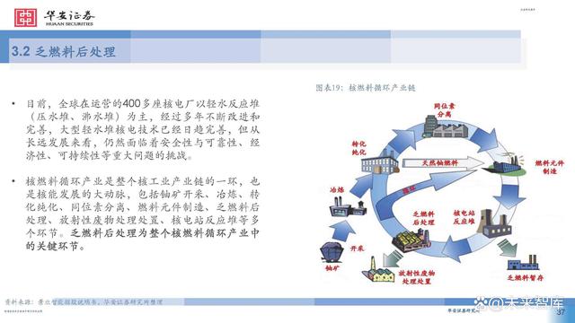 目前,全球在運營的400多座核電廠以輕水反應堆 (壓水堆、沸水堆)為主,經過多年不斷改進和 完善,大型輕水堆核電技術已經日趨完善,但從 長遠發(fā)展來看,仍然面臨著安全性與可靠性、經 濟性、可持續(xù)性等重大問題的挑戰(zhàn)。 核燃料循環(huán)產業(yè)是整個核工業(yè)產業(yè)鏈的一環(huán),也 是核能發(fā)展的大動脈,包括鈾礦開采、冶煉、轉 化純化、同位素分離、燃料元件制造、乏燃料后 處理、放射性廢物處理處置、核電站反應堆等多 個環(huán)節(jié)。乏燃料后處理為整個核燃料循環(huán)產業(yè)中 的關鍵環(huán)節(jié)。