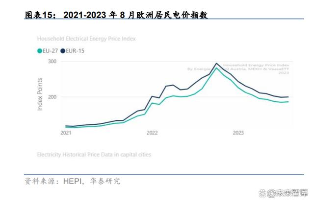 同電價歷史時期戶儲安裝量仍維持高速增長。根據(jù) HEPI,2023 年 8 月歐洲 27 國電價指數(shù) 185.80/氣價指數(shù) 166.52,與 2022 年年初水平接近,高于 2021 年及之前的水平。根據(jù) Solar power Europe 歷史數(shù)據(jù),2021 年歐洲戶儲新增戶儲裝機規(guī)模 2.294GWh,同增 106.9%。 當前電價/氣價雖然較前期高點有下降,但儲能回報率仍較高,考慮到相較 2021 年,當前 產(chǎn)品準備更為多元,電池等原材料成本開始下降,用戶教育更為充分,歐洲戶儲仍有較高 增長動力。