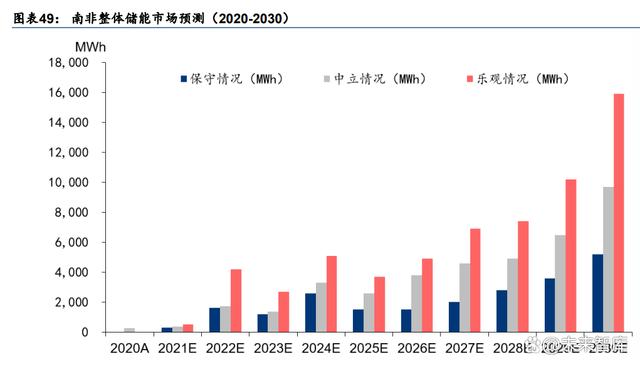 政策刺激疊加電力危機,南非戶儲市場增長預(yù)計有可持續(xù)性。為了緩解電力危機,南非政 府宣布 2023 與 2024 年全國電價將分別調(diào)漲 18.56%與 12.74%,以此來抑制居民用電需求。 從 23 年最新數(shù)據(jù)來看,23 年 1-7 月中國向南非出口逆變器累計 31.08 億元,同比+487.7%; 平均價格 2152.0 元/臺,同比 22 年 1-7 月+105.6%,中國出口南非逆變器價量雙升??紤] 到南非亦在跟隨全球腳步逐步擺脫煤炭發(fā)電依賴,燃煤電站大規(guī)模建設(shè)受阻,電力問題短 期無法解決,我們認為南非儲能市場的高增速具有較好的持續(xù)性。根據(jù)世界銀行預(yù)測, 2020-2030 年南非儲能電池裝機的年復(fù)合增速在 34%-50%之間,在悲觀/中性/樂觀場景假 設(shè)下,2030 年南非儲能電池裝機量將達到 5.2/9.7/15.9GWh。