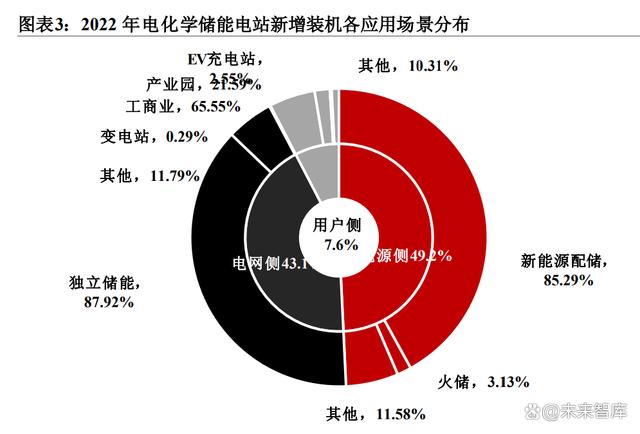 主要場景包括工商業(yè)、產(chǎn)業(yè)園、EV充電站、港口岸電、其他海島/校園/社區(qū)等。儲(chǔ)能裝置在用電低谷時(shí)充電,在用電高峰時(shí)放電,利用高峰和低谷的電價(jià)差,節(jié)省用電費(fèi)用,從中可獲取經(jīng)濟(jì)效益,因此戶用儲(chǔ)能主要集中在高電價(jià)及高電價(jià)差的國家或地區(qū)。國內(nèi)用戶側(cè)以工商業(yè)儲(chǔ)能(占比65.55%)為主,產(chǎn)業(yè)園儲(chǔ)能、EV充電站的占比也在逐漸提升,在新增裝機(jī)中占比21.59%、2.55%。