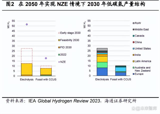 2022 年全球氫氣總生產(chǎn)量約 9500 萬(wàn)噸(同比+3%),其中中國(guó)產(chǎn)量占比 30%, 目前傳統(tǒng)化石燃料制灰氫仍為主要方式。2022 年全球氫氣總生產(chǎn)量約 9500 萬(wàn)噸,同比 增長(zhǎng) 3%,大部分氫氣通過(guò)傳統(tǒng)化石燃料生產(chǎn),其中天然氣制氫是最主要的制氫方法, 占產(chǎn)氫總量的 62%,其次為煤炭制氫占 21%,主要在我國(guó),工業(yè)副產(chǎn)制氫占 16%。分 區(qū)域來(lái)看,全球氫產(chǎn)量的 70%集中在中國(guó)、美國(guó)、中東、印度和俄羅斯,其中中國(guó)由于 煉油和化工行業(yè)的需求氫產(chǎn)量約占全球的 30%。 目前低碳?xì)洚a(chǎn)量?jī)H占 0.7%,IEA 預(yù)計(jì)到 2030 年低碳?xì)洚a(chǎn)量可達(dá) 2000 萬(wàn)噸。2022 年全球低碳?xì)洚a(chǎn)量?jī)H不到 100 萬(wàn)噸,占?xì)錃饪偖a(chǎn)量的 0.7%。其中電解水技術(shù)生產(chǎn)的綠 氫產(chǎn)量在快速增長(zhǎng),但 2022 年產(chǎn)量仍不足 10 萬(wàn)噸,同比增長(zhǎng) 35%。IEA 預(yù)測(cè),假設(shè)已 宣布的建設(shè)項(xiàng)目全部投產(chǎn),到 2030 年,低碳?xì)洚a(chǎn)量可達(dá) 2000 萬(wàn)噸,其中主要分布在歐 洲(30%)和澳大利亞(20%)地區(qū)。