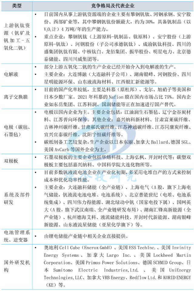 當(dāng)前國內(nèi)全釩液流電池市場總體體量較小,龍頭格局未顯,產(chǎn)業(yè)仍處于發(fā)展初期。產(chǎn)業(yè)鏈各環(huán)節(jié)的競爭格局和代表企業(yè)如下表所示。