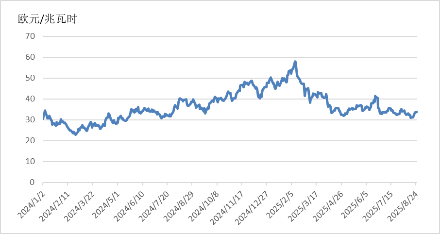 8月,歐洲天然氣價(jià)格先降后升。8月上中旬,西北歐多數(shù)地區(qū)氣溫較為穩(wěn)定,制冷需求窄幅波動(dòng),住宅和商業(yè)部門天然氣消費(fèi)量有所下跌。供應(yīng)方面,挪威管道氣進(jìn)口量持續(xù)強(qiáng)勁,液化天然氣進(jìn)口量也表現(xiàn)穩(wěn)定,高于近些年季節(jié)性平均水平,供給整體平穩(wěn)且儲(chǔ)氣庫注氣進(jìn)展順利。此外,市場(chǎng)對(duì)于美俄峰會(huì)進(jìn)展持樂觀預(yù)期,疊加原油、煤炭等能源價(jià)格呈下降趨勢(shì),多空交織下,西北歐氣價(jià)震蕩下行。8月15日,TTF天然氣期貨價(jià)格收于31.031歐元/兆瓦時(shí),為2024年8月以來的最低水平。8月下旬,挪威新一輪管道氣大規(guī)模檢修期臨近,美國颶風(fēng)導(dǎo)致多處LNG出口設(shè)施檢修,歐洲LNG進(jìn)口量與北海管道氣供給均減少;同時(shí)歐洲地下儲(chǔ)氣庫注氣量周環(huán)比下降5.4%。此外,俄烏和談并無實(shí)質(zhì)性進(jìn)展削弱了市場(chǎng)對(duì)于俄氣回歸的預(yù)期,供給整體減少,疊加歐洲新能源發(fā)電量預(yù)期下調(diào),利好因素主導(dǎo)市場(chǎng)氛圍,TTF近月期貨價(jià)格快速反彈,升至33歐元/兆瓦時(shí)以上。
