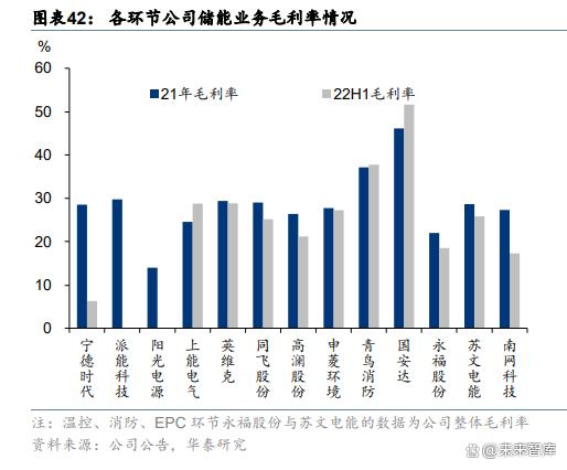 各環(huán)節(jié) 22H1 毛利率相比 21 年全年普遍走低,消防環(huán)節(jié)毛利率水平最高。21 年電芯環(huán)節(jié) 兩家企業(yè)儲(chǔ)能業(yè)務(wù)毛利率處于 28%-30%,22H1 受到上游鋰礦價(jià)格高漲且傳導(dǎo)滯后影響, 盈利空間被顯著壓縮,以寧德時(shí)代為例,22H1 毛利率下滑至 6.43%。消防環(huán)節(jié)毛利率最高, 且兩家公司 22H1 毛利率相比 21 年均有提升,我們認(rèn)為主要系公司產(chǎn)品結(jié)構(gòu)優(yōu)化致整體毛 利率水平抬升。儲(chǔ)能 PCS 及系統(tǒng)集成環(huán)節(jié)內(nèi)各公司由于業(yè)務(wù)結(jié)構(gòu)及出貨市場的不同毛利率 水平差異較大,陽光電源/上能電氣 2021 年儲(chǔ)能業(yè)務(wù)毛利率水平分別為 14.11% /24.52%。 溫控環(huán)節(jié)毛利率普遍在 25%-30%之間。EPC 環(huán)節(jié) 21 年毛利率普遍在 20%-30%之間,22H1 毛利率水平出現(xiàn)明顯下滑。