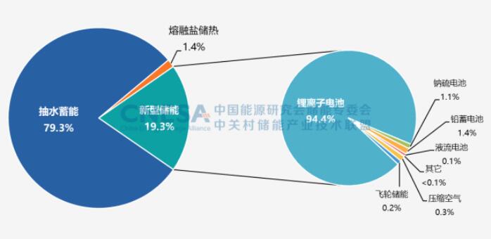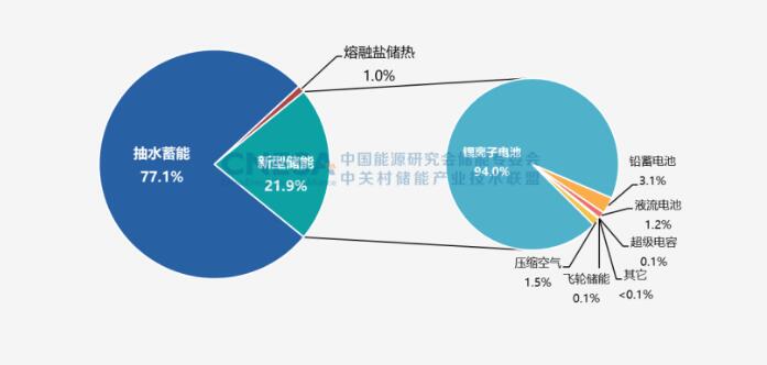 2022年,中國新增投運(yùn)電力儲能項(xiàng)目裝機(jī)規(guī)模首次突破15GW,達(dá)到16.5GW,其中,抽水蓄能新增規(guī)模9.1GW,同比增長75%;新型儲能新增規(guī)模創(chuàng)歷史新高,達(dá)到7.3GW/15.9GWh,功率規(guī)模同比增長200%,能量規(guī)模同比增長280%;新型儲能中,鋰離子電池占據(jù)絕對主導(dǎo)地位,比重達(dá)97%,此外,壓縮空氣儲能、液流電池、鈉離子電池、飛輪等其它技術(shù)路線的項(xiàng)目,在規(guī)模上有所突破,應(yīng)用模式逐漸增多。
