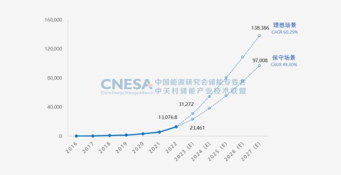 CNESA自2014年起對中國儲能市場規(guī)模進(jìn)行預(yù)測,本版白皮書中,CNESA基于保守場景(定義為政策執(zhí)行、成本下降、技術(shù)改進(jìn)等因素未達(dá)預(yù)期的情形)和理想場景(定義為各省儲能規(guī)劃目標(biāo)順利實(shí)現(xiàn)的情形)對2023-2027年中國新型儲能市場的規(guī)模和發(fā)展趨勢進(jìn)行預(yù)測。