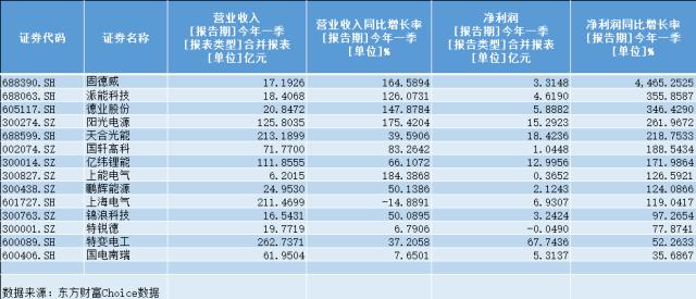 下游應(yīng)用端需求的大幅提升,也使得儲(chǔ)能行業(yè)公司迎來了業(yè)績爆發(fā)。從一季報(bào)表現(xiàn)來看,證券之星篩選了表現(xiàn)出眾的一些上市公司。如下圖所示: