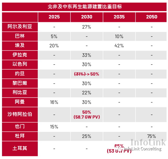 由于既有較成熟市場的商業(yè)模式與供應(yīng)鏈成型,進(jìn)入門坎拉高也更為競爭,因此新興市場如東南亞、中東、南美、非洲等成為企業(yè)欲搶占布局之區(qū),且受到光伏市場的刺激會帶動儲能維持熱度與需求,應(yīng)用面今年則以表后工商業(yè)更受關(guān)注。然而,大部分此些市場的政策、程序、供應(yīng)鏈、再生能源規(guī)模、電網(wǎng)、建設(shè)環(huán)境等都遠(yuǎn)不如較成熟市場,相對也就需要更長的爬坡期且影響發(fā)展速率變量更多,導(dǎo)致該市場可能大幅起落。例如,新興市場目前出臺的政策多是以整體再生能源建置為目標(biāo),對于儲能的需求或發(fā)展尚無明確指引,以下表整理的北非與中東為例;其次,中國六月份的儲能裝機(jī)規(guī)模中工商業(yè)占比僅1%,說明市場需求與情緒雖旺盛,但實(shí)際規(guī)模需更審慎評估。
