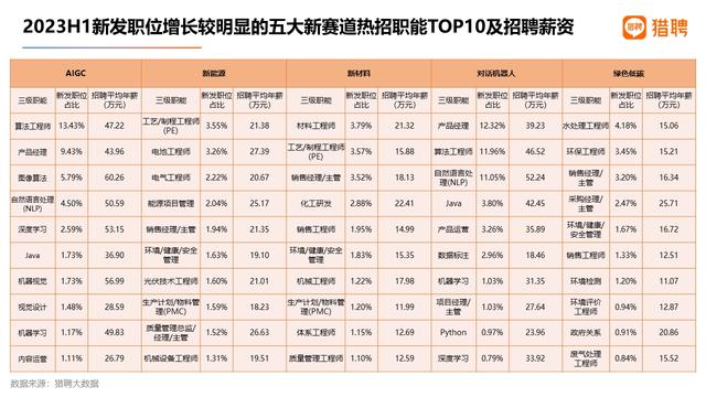 獵聘大數(shù)據(jù)研究院發(fā)布的《2023上半年就業(yè)趨勢大數(shù)據(jù)洞察》顯示,AIGC(人工智能生成內(nèi)容)、新能源、新材料、對話機(jī)器人、綠色低碳五個賽道的新發(fā)職位今年上半年同比增長相對明顯,其中新能源位列第二位,數(shù)量同比增長42.49%。