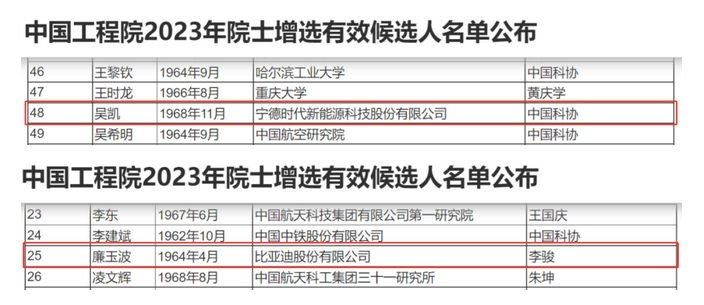 比亞迪首席科學家廉玉波由中國工程院院士李駿提名推薦,寧德時代首席科學家吳凱由中國科協(xié)提名推薦。