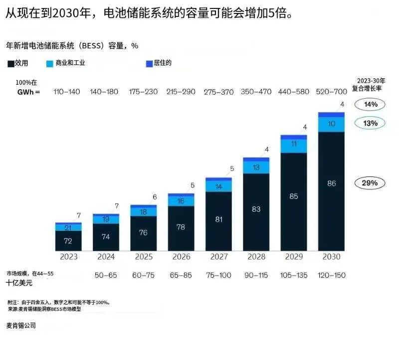 商業(yè)和工業(yè)(C&I,工商儲)是第二大細(xì)分市場,我們預(yù)測其將以13%的復(fù)合年增長率,使C&I到2030年的年增量達(dá)到52至70GWh。