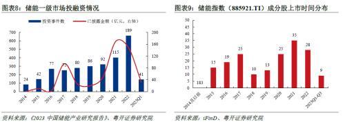 從儲能公司投融資角度來看,近兩年儲能一級和二級市場投融資熱度高漲。不完全統(tǒng)計數(shù)據(jù)顯示,截至2023年一季度,300余家儲能企業(yè)獲得融資,涉及投融資事件900余件、已披露融資金額近2000億元。其中,2021年儲能披露融資金額近600億元,2022年儲能行業(yè)全年融資189次。二級市場方面,近三年儲能相關(guān)公司IPO多達97家,占儲能指數(shù)(885921.TI)比重達24.8%,此外也有部分上市公司于近些年實現(xiàn)儲能業(yè)務(wù)的突破和轉(zhuǎn)型。