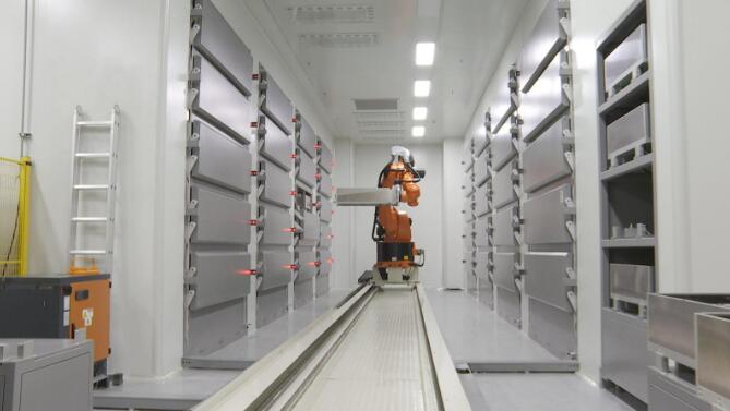在干燥車間內(nèi),六軸機(jī)器人正在搬運(yùn)電池