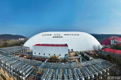 2024年1月9日,安徽省蕪湖市,繁昌區(qū)繁陽鎮(zhèn)庫山村,航拍正在并網(wǎng)發(fā)電的海螺集團10MW/80MWh二氧化碳儲能示范系統(tǒng)項目。