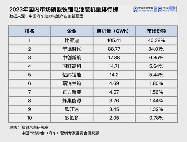 在動力電池領域、特別是磷酸鐵鋰電池領域,寧德時代面對著來自比亞迪強有力的挑戰(zhàn)。中國汽車動力電池產(chǎn)業(yè)創(chuàng)新聯(lián)盟公布的數(shù)據(jù)顯示,2023年比亞迪磷酸鐵鋰動力電池的裝機量已經(jīng)超過寧德時代,拿下40%以上的市場份額。