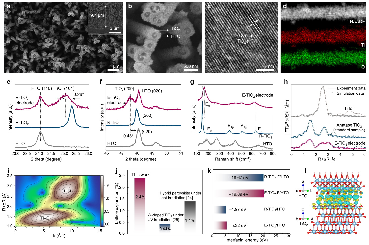 要點(diǎn)2:SEM(圖2a,b)表明晶格膨脹二氧化鈦(E-TiO2)具有核殼結(jié)構(gòu)的納米線陣列。SAED以及HRTEM發(fā)現(xiàn)E-TiO2中的TiO2和HTO均為準(zhǔn)單晶結(jié)構(gòu)(圖2c)。EDSmapping表明O元素與Ti元素的均勻分布(圖2d)。XRD圖譜表明E-TiO2在(101)、(004)和(200)三個(gè)晶面方向?qū)?yīng)的布拉格衍射峰均有明顯的小角度偏移(圖2e,f)。結(jié)合XRD精修得出E-TiO2的晶胞體積膨脹率為2.4%。拉曼測試表明E-TiO2位于142 cm–1和638 cm–1處的特征峰分別發(fā)生藍(lán)移和紅移的現(xiàn)象,證明了Ti-O鍵長的增加(圖2g)。最后,利用XAFS進(jìn)一步分析Ti的價(jià)態(tài)以及鍵長(圖2h,i),結(jié)果表明Ti-Ti鍵的長度增加,進(jìn)一步佐證了晶格的膨脹。與實(shí)現(xiàn)晶格膨脹的常規(guī)方法相比,該研究在無需外場輔助的情況下即可實(shí)現(xiàn)(圖2j)。為了進(jìn)一步深入分析晶格膨脹的機(jī)理,通過DFT比較了HTO分別與R-TiO2和E-TiO2的界面能(圖2k)。圖 2l 中的微分電荷密度計(jì)算表明氟原子可以有效地在HTO (100)和TiO2 (001)之間通過H-F共價(jià)鍵形成連接(圖2k),誘導(dǎo)具有膨脹晶格的銳鈦礦TiO2生長。
