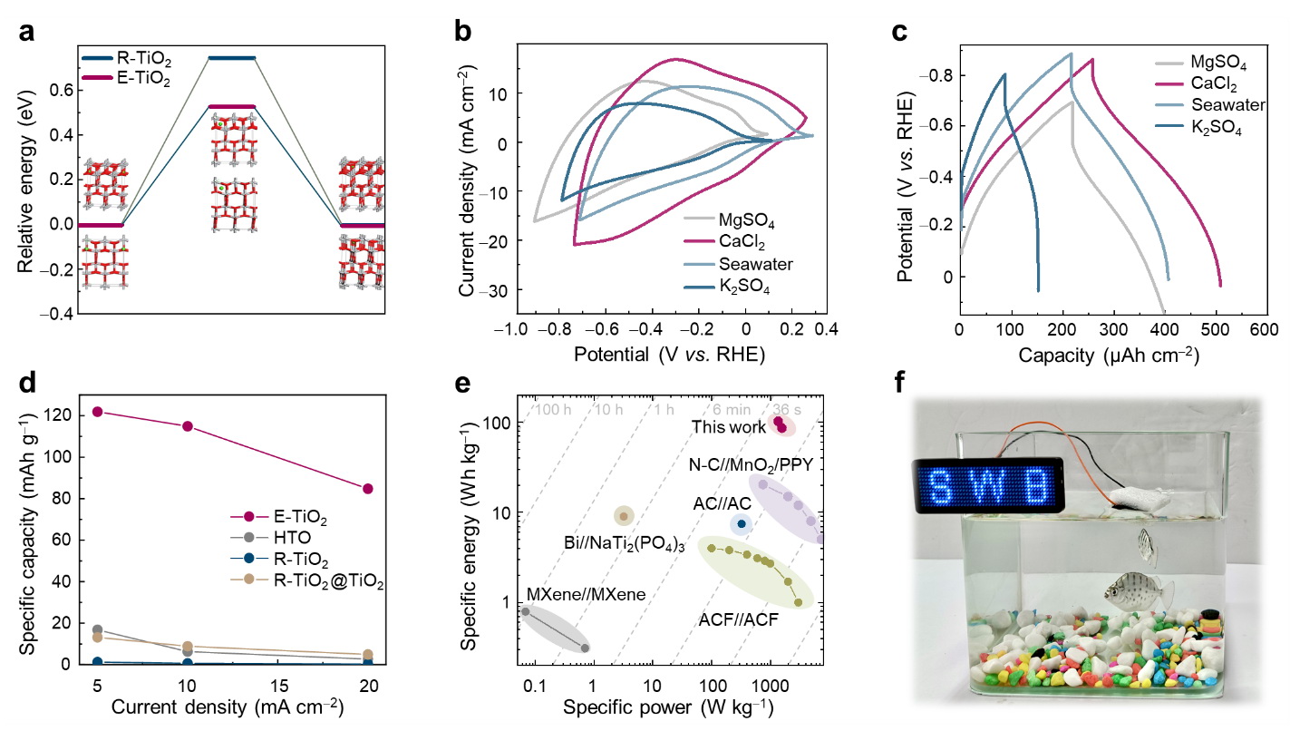 要點(diǎn)5:圖5a的DFT計(jì)算表明,E-TiO2同樣可以降低其他陽離子的擴(kuò)散勢壘(例如Ca2+)。通過CV和GCD(圖5b,c)可知,E-TiO2在其他電解液中也具有類似于儲鈉時(shí)的贗電容主導(dǎo)特性。當(dāng)電流密度為10mA/cm2時(shí),E-TiO2儲存Ca2+和Mg2+的面容量分別為247和182 μAh/cm2,接近Na+的容量(259 μAh/cm2)。直接使用天然海水作為電解液,構(gòu)建了以E-TiO2為負(fù)極材料,電催化劑為正極的海水二次電池。在5 mA/cm2的電流密度下,E-TiO2的比容量為152 mAh/g(圖5d)。基于正負(fù)極活性物質(zhì)的質(zhì)量,新型海水電池的比能量/功率密度優(yōu)于當(dāng)前報(bào)道的可充放海水儲能器件、水系鈉鉀及鎂鈣離子電池(圖5e)。團(tuán)隊(duì)對二次海水電池的原型也進(jìn)行了展示(圖5f)。