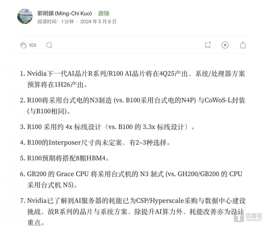天風(fēng)國際證券分析師郭明錤指出,英偉達(dá)下一代R系列/R100 AI芯片將于2025年第四季度量產(chǎn),采用臺積電3nm制程、4個(gè)reticle設(shè)計(jì),搭配8顆HBM4,重點(diǎn)改善能耗。最早在明年,R100 AI GPU就將登場。