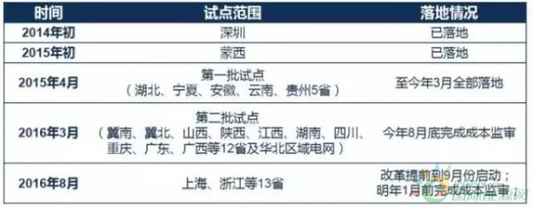 原定2017年開展的14個省級電網(wǎng)輸配電價改革提前至2016年9月啟動,基本實現(xiàn)省級電網(wǎng)的全覆蓋;計劃于2017年1月底完成成本監(jiān)審工作。